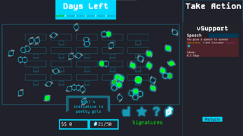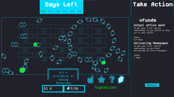 Use your abilities (buttons on the right), to increase the awareness, trust, and support of your peers. You will have to balance giving speeches to engage the students around you, throw pizza parties to increase their trust in you (which makes your speeches more effective), and working on the side to earn funds for the pizza parties.